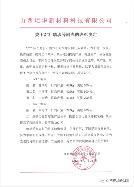 2020年2月份,因六车间齿球合同任务紧张,为了进一步提升操作技能,提高工作效率,从而达到提高产量、促进生产、确保任务完成之目的,公司在六车间齿球岗位开展了岗位技能操作比赛,从产量、质量、出勤等方面进行考核,评选出首批“岗位操作能手”。分别是:杜瑞珍、张海清、宗丽萍、史会珍四名同志。卫建杰在齿球生产过程中,根据现场情况,结合操作流程,针对齿球生产情况摸索、总结经验,对车间齿球生产线提出优化建议,经车间主管及技术总监反复推敲确认,最终建议被采纳,大大提高了齿球质量,荣获“合理化建议奖”。